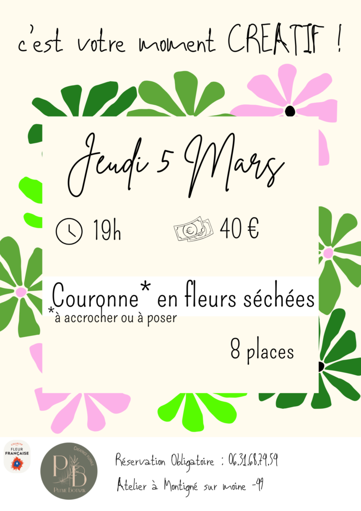 Un moment créatif pour vous, pour partager un moment ! Venez tout simplement, et repartez avec votre couronne à poser ou à accrocher au mur. Le tout en travaillant de la fleur française, couleur et variétés au choix. Vous devriez également aimer Atelier » Bouquet structure » 22/02/2026 Atelier » Kokédama » 22/02/2026 Atelier » Panier en fleurs » 22/02/2026 Atelier « Couronne en fleurs séchées »